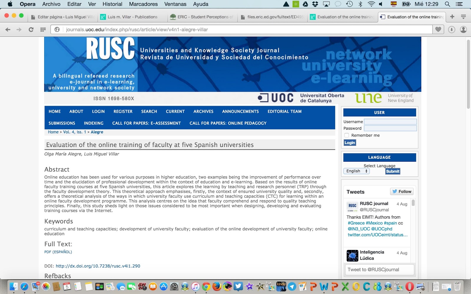 Alegre, O.M. y Villar, L.M. (2011). «Faculty Professional Learning: An Examination of Online Development and Assessment Environments». Hershey: IGI GLOBAL, Chapter 6, pp. 66-92.